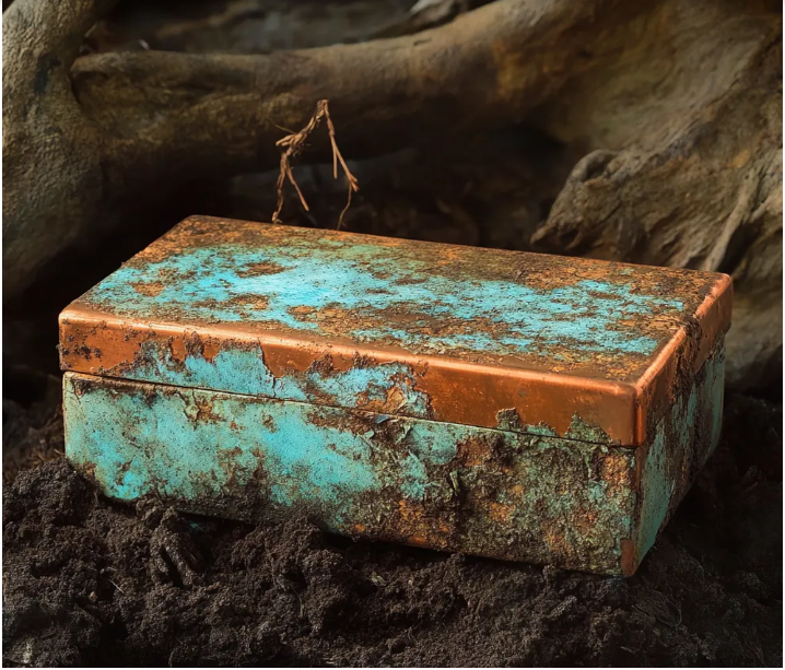 Orada, karanlık toprağın içinde, gömülü bir yıldız gibi, yüzeyi zamanla turkuaz rengine dönüşmüş küçük bir bakır kutu yatıyordu.