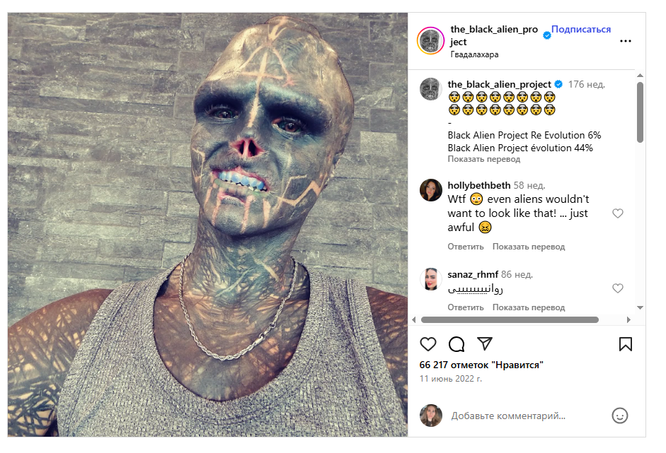 Instagram’da 1,2 milyon takipçisi var ve pek çok insan vücut modifikasyonlarına canlı bir ilgi gösteriyor.”