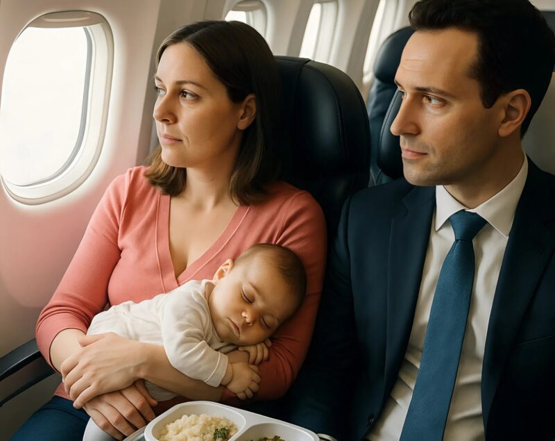 Hostes yemeği getirdiğinde, düzgünce yemek yemeyi hayal bile edemedim. Bebeğim sürekli kucağımdaydı — emzirme, alt değiştirme, uyutmaya çalışma… hepsiyle uğraşıyordum.