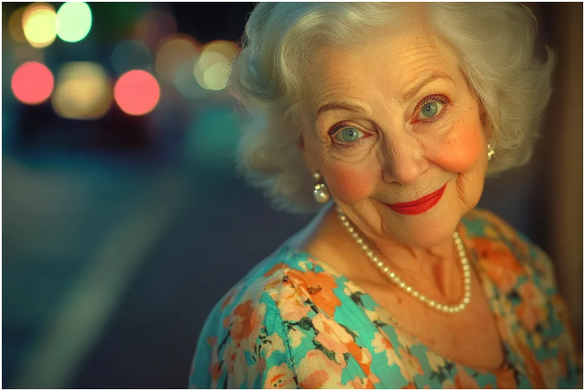 Üzerinde 1960’lardan gelmiş gibi görünen soluk mavi bir şapka ve döneme uygun çiçek desenli bir elbise vardı. Boynunda nazikçe parlayan bir inci kolye takılıydı.